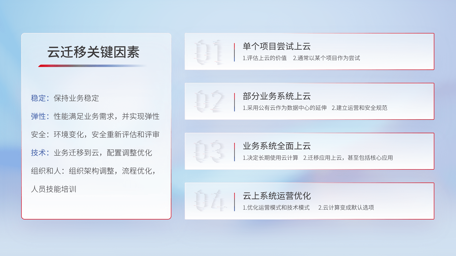 结合实际业务,,,从规划设计、、、云平台选型、、、云原生改造、、数据迁移、、、、集成交付,,迁移全过程为客户识别最佳上云路径,,,,做好风险识别管理,,,设计网络架构、、身份权限、、、、安全审计合规、、、、操作审计、、、日志审计、、、、监控告警策略、、多站点容灾设计等,,,,对云上基础设施进行整体规划,,,,提升IT治理水平,,,,以满足弹性、、、高可用、、高性能的需求。。。。