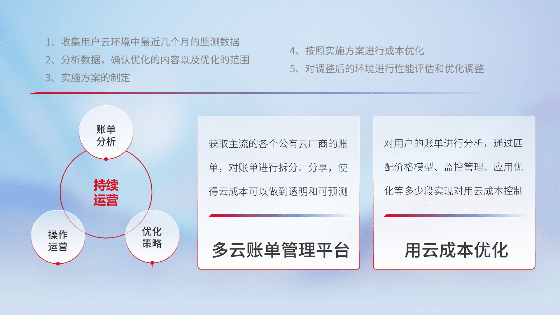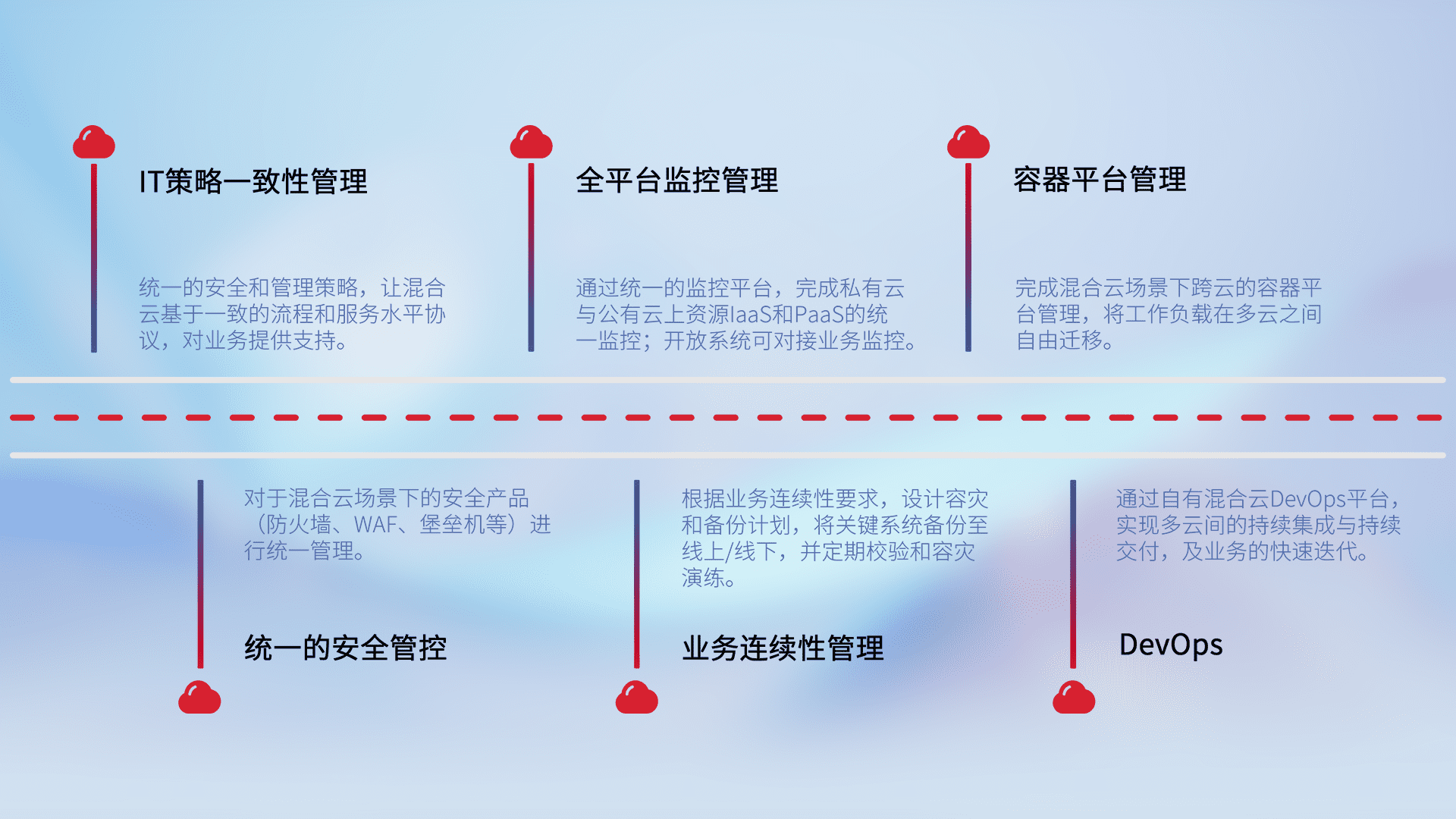 通过多云纳管,,,以统一的资源数据模型把客户的云资源进行抽象和封装,,,,进而实现对多云资源的统一操作,,,,保障云资源管理的可靠性、、稳定性与可用性。。。。量身定制化运维内容,,,配置、、、开发运维、、补丁管理、、、、备份、、、、监控、、认证和访问管理、、、审计和日常巡检等,,,,保障在用云过程中的可靠度,,,,稳定度以及高可用率。。。