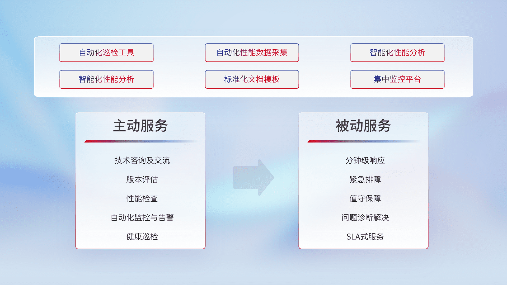 智能化工具和标准化文档,,,保障服务质量,,提供主动服务(包含技术咨询、、版本评估、、性能检查、、、自动化监控与告警、、、、健康巡检)和被动服务包含(分钟级响应、、、、紧急排障、、、、值守保障、、、、问题诊断解决、、SLA服务)。。
