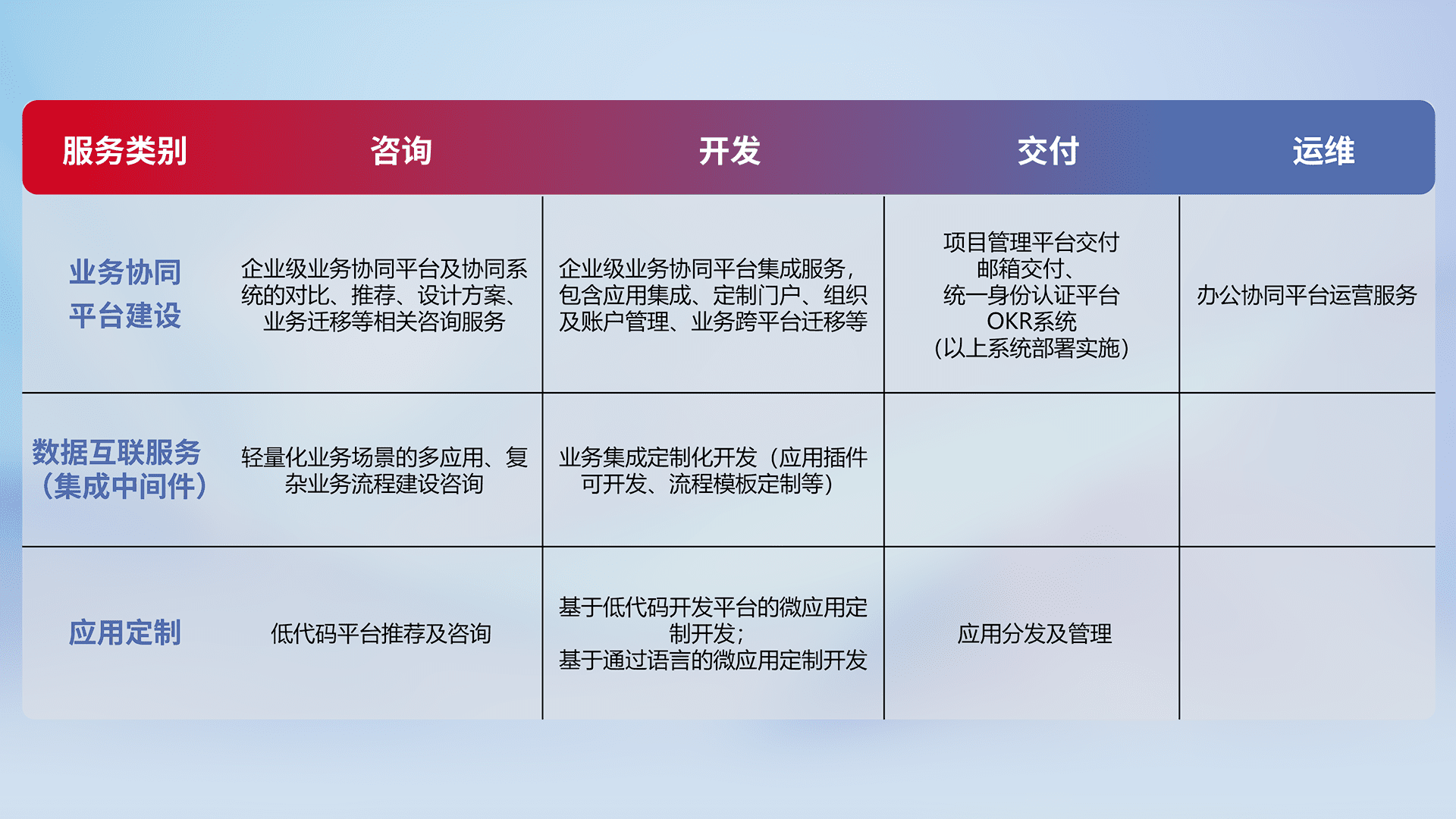 针对钉钉、、、企微、、、、IDaas等平台级产品提供产品的规划、、、方案、、、交付、、定制化开发等服务,,实现如统一协同办公、、、智能客户服务、、、、混合会议管理、、、、智能数据查询、、、、等业务场景,,,实现数字化转型。。。